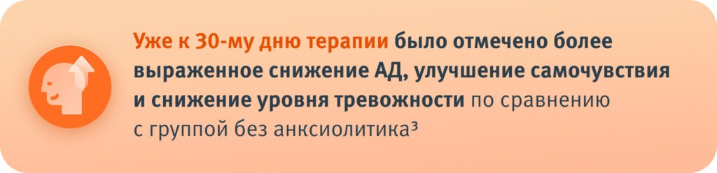 Важно отметить, что колебания АД часто обусловлены не только органическими нарушениями, но и психоэмоциональными факторами, прежде всего — тревожными расстройствами1. Поэтому в ряде случаев стандартной антигипертензивной терапии может оказаться недостаточно. Для стабилизации суточного профиля АД требуется комплексный подход, включающий коррекцию тревожного компонента, например, с включением в схему лечения анксиолитиков с вегетостабилизирующим действием.