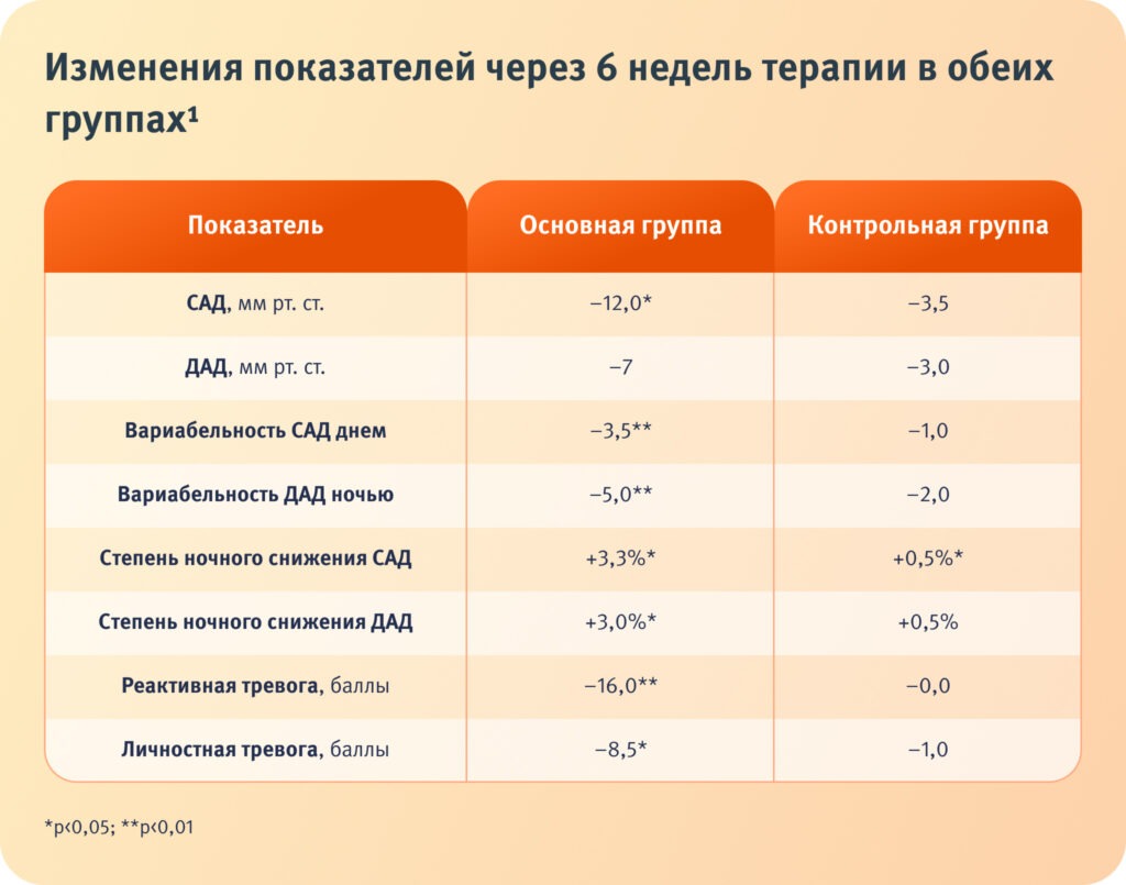 Через 6 недель оценивали изменения основных показателей контроля АГ и уровня тревоги1.