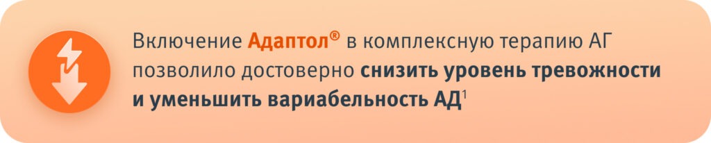 Добавление Адаптол® к стандартной антигипертензивной терапии у пациентов с тревожностью и нестабильным профилем АД позволяет достоверно улучшить его контроль, снизить вариабельность и нормализовать психоэмоциональное состояние. Препарат может рассматриваться как обоснованный компонент комплексного подхода при лечении АГ с вегетативными и тревожными проявлениями1-3.